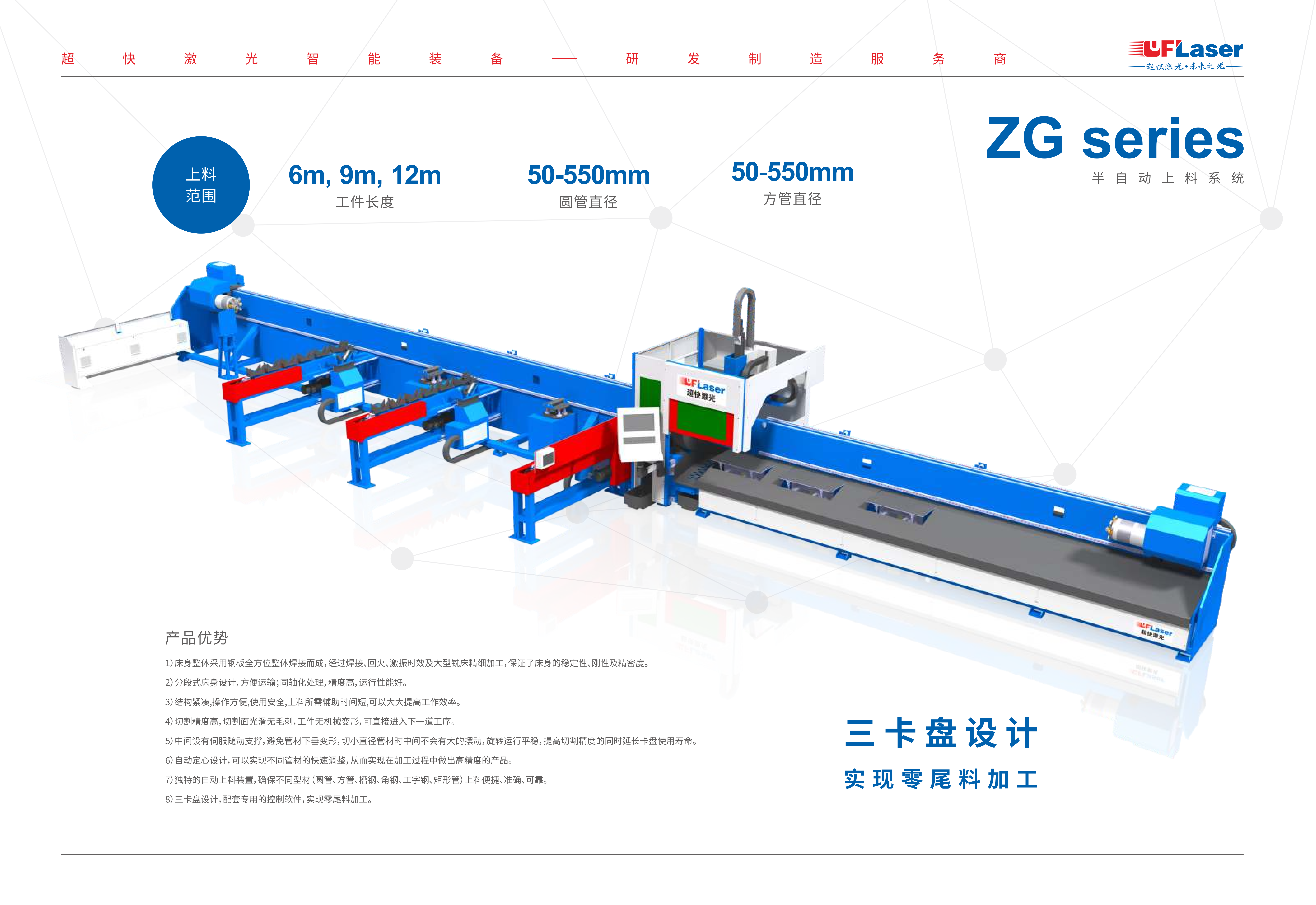 1.專用切管機采用三個自動夾盤設計,不受加工范圍限制實現零尾料。
